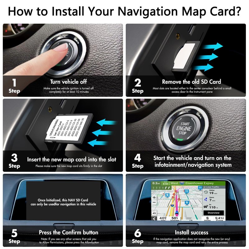 - Plug and Play : Power off the vehicle. Insert the GPS Navigation SD Card into the slot until it clicks into place. Start the engine. Wait for the navigation screen to display the completion of the installation. 2. Please make sure not to turn off the engine during this process.