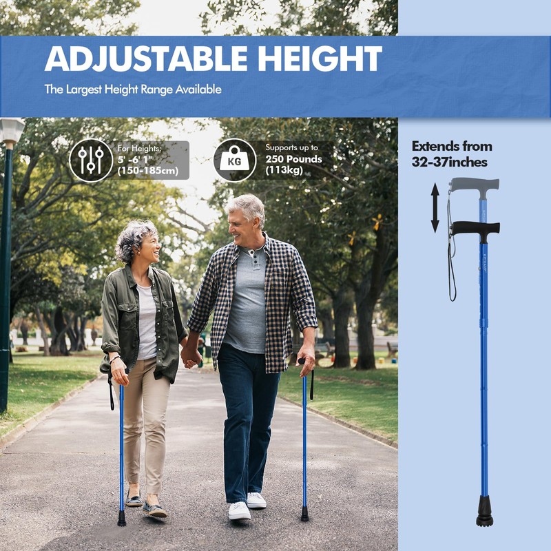 - LIGHTWEIGHT & ADJUSTABLE ALUMINUM FRAME: Made with durable, Aviation aluminum, the folding cane is lightweight yet sturdy, and weighing only 0.84 lbs, supporting up to 250 pounds. Can be easily adjusted in height, from a minimum of 32" to a maximum of 37".