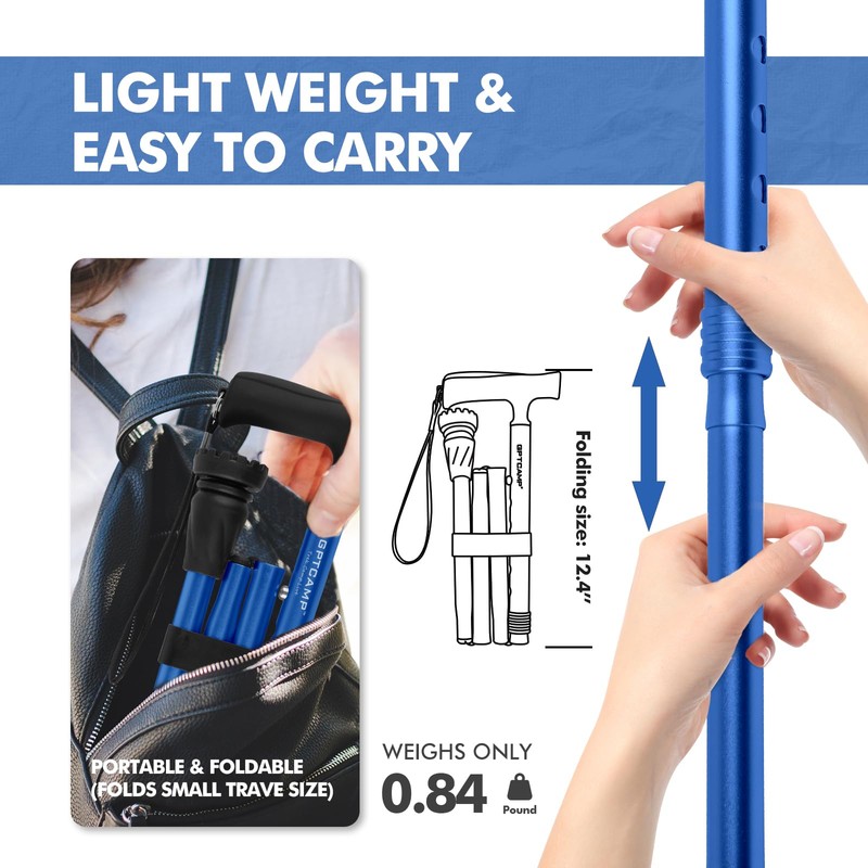 - COLLAPSIBLE & COMPACT DESIGN FROM A TRUSTED BRAND: The GPTCAMP folding cane securely locks in place, providing extra stability while walking on any surface. Folding at three points, this collapsible cane fits easily into backpack,, briefcases, carry-ons, or wheelchair bags for on-the-go assistance.
