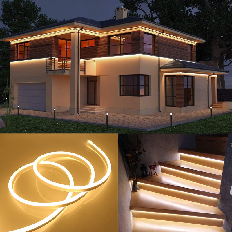 - IP65 Waterproof. Waterproof PVC pipe protect the LEDs from dust and water droplets, can be installed indoors and outdoors. ( both ends of the LED strip and the power cord should be kept dry)