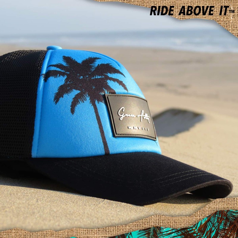 - HAWAIIAN HAT- this is a 2 tone snapback hat with a light blue foam front featuring palm trees and black mesh. Stand out in the cool printed design!