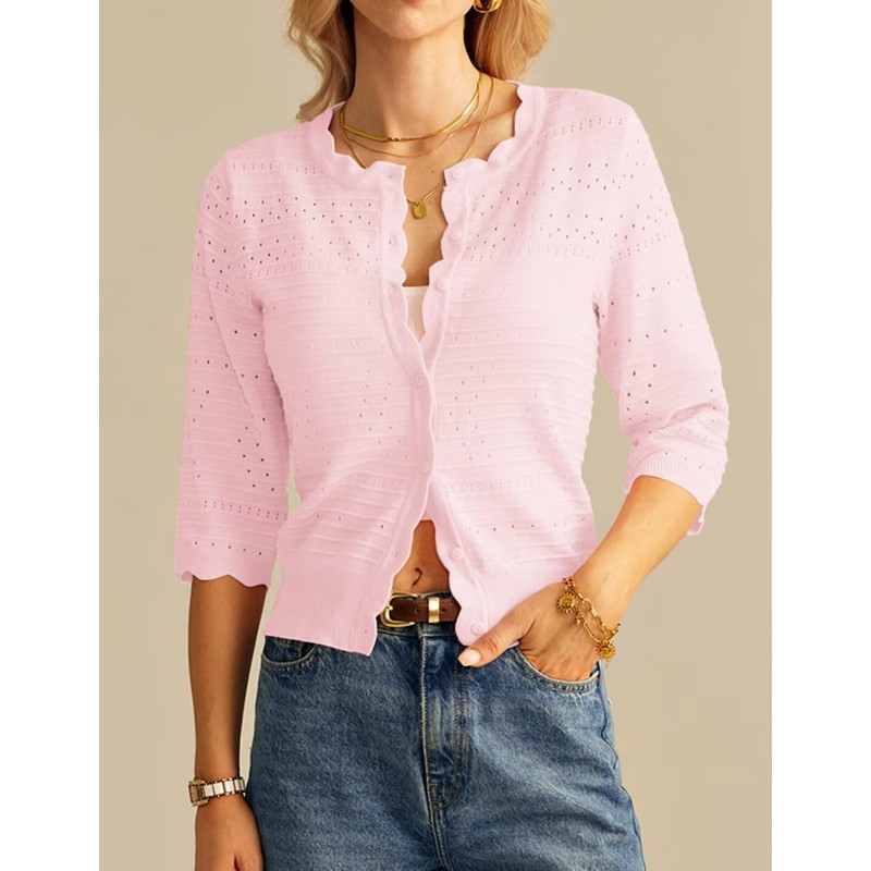 - 【Cardigan Sweater Women 】Stylish hollowed-out textured cardigan with a waved neckline, placket, and 3/4 sleeve openings. Tailored and fitted design for a more stylish look, cropped cardigan sweater for women business casual.