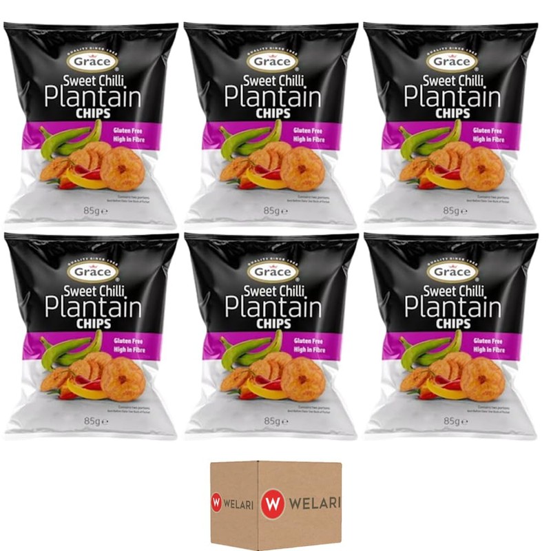 Grace Sweet Chilli Plantain Chips 85g Pack of 6 Vegan Bites High in Fibre Gluten Free Banana Crisps Snack with Welari Thank You Card | (6pack) (510g)