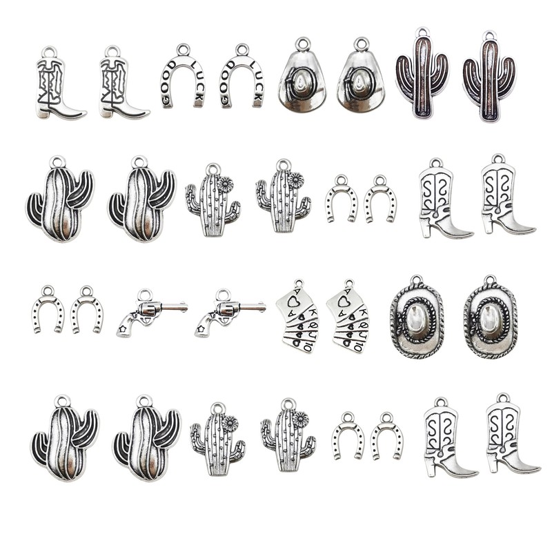 GraceAngie 120 Pieces Western Cowboy Charms for Jewelry Making Antique Silver Golden Cowboy Boot Hat Cactus Charms Western Pendant Cowboy Charms for Bracelet Necklace (Silver)