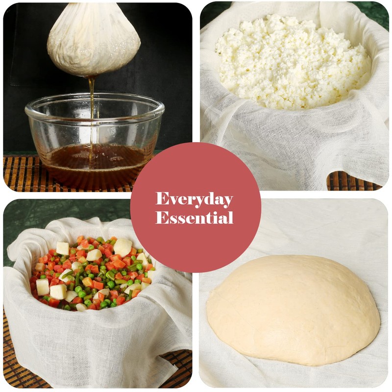 • REUSABLE AND EASY TO USE: The high-quality cotton material of cheesecloth is reusable, so you don't have to worry about waste. Simply boil it in water for 15 minutes to remove any trapped particles and it's ready to use again