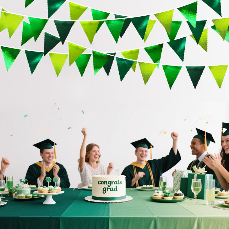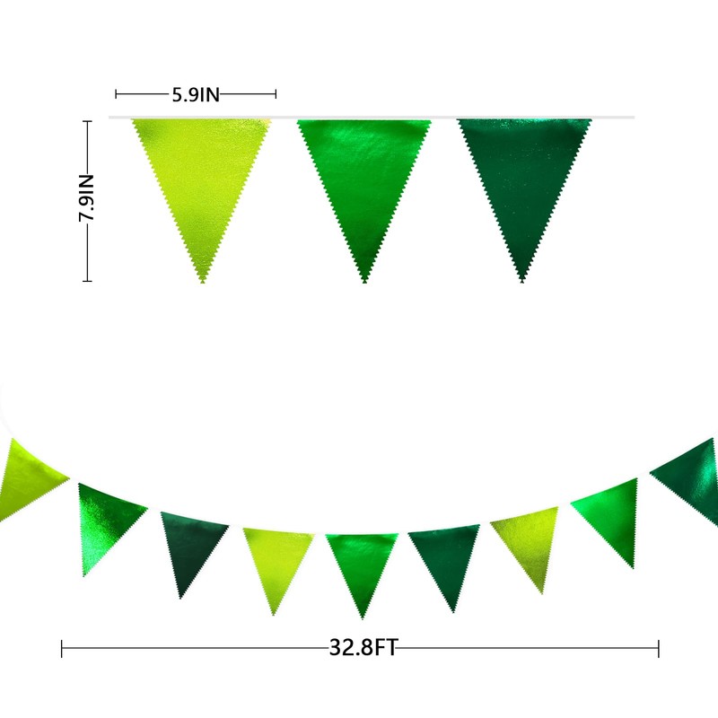 • Environmental Material - Our triangle flag banner bunting are made of double-sided dark green、bright green and light green metallic fabric cloth,Unique wavy neat cut,soft and comfortable touch.safe and odorless,washable and waterproof,durable and reusable.