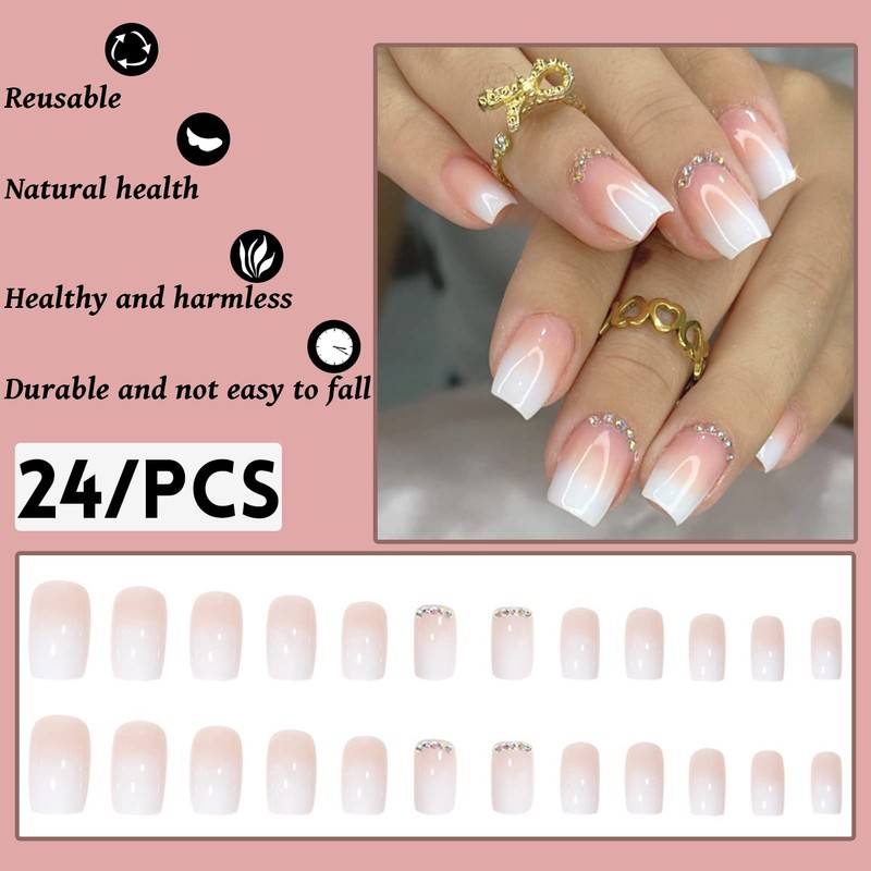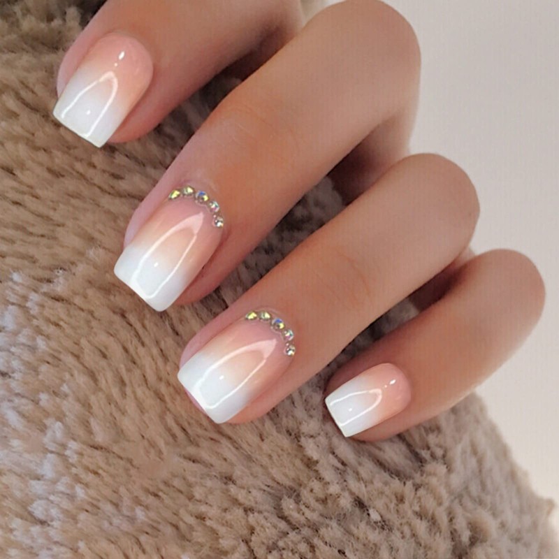 Gradient White Press on Nails Short Square False Nails with Glue Rhinestones Designs Glue on Nails Artificial Acrylic Fake Nails Glossy Office Home Stick on Nails for Women Girls