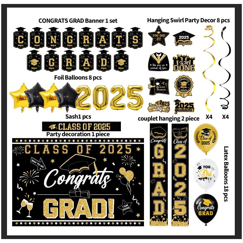 - Package Include: Our 2025 graduation decorations kit includes1pcs "CONGRATS GRAD" banner, 1pcs class of 2025 Backdrop, 1pcs 2025 balloons, 1pcs graduation proch sign, 8pcs hanging swirls, 8pcs decorative cards, 4pcs star foil balloons, and 18pcs balloons, enough to decorate your graduation party, you don't have to spend a lot of time looking for different decorations