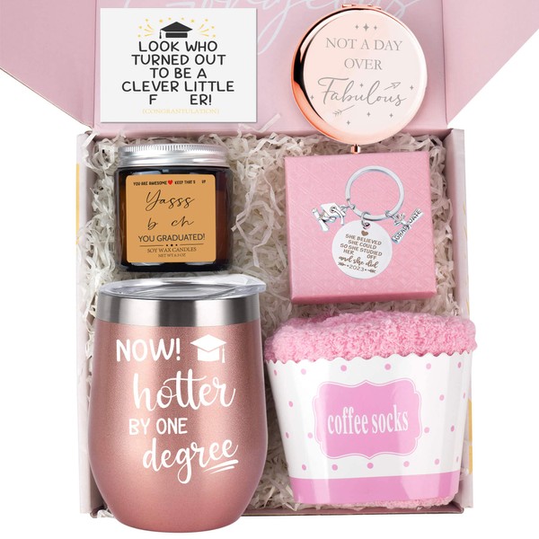 - đăIthmahco 2023 Graduation Gift Setă The graduation gift set includes a tumbler for wine/coffee, a relaxing lavender candle, an inspirational keychain, stylish socks, a portable makeup mirror, a greeting card filled with best wishes, and a delicately wrapped gift box! This would be an inspiring and heartwarming gift. Perfect for daughter, niece, sister, friend, wife, and yourself!