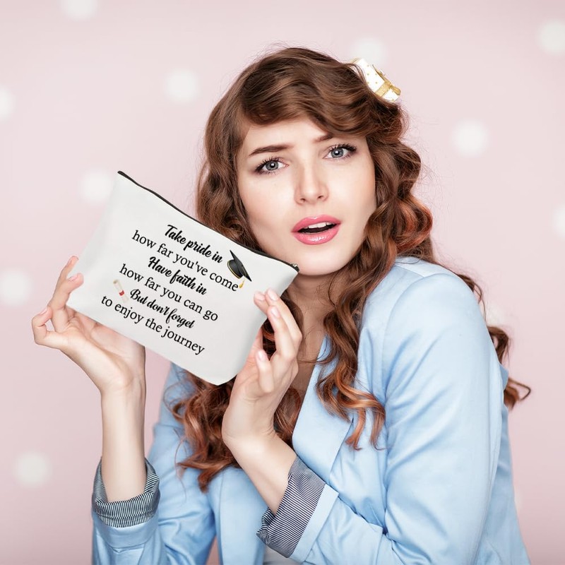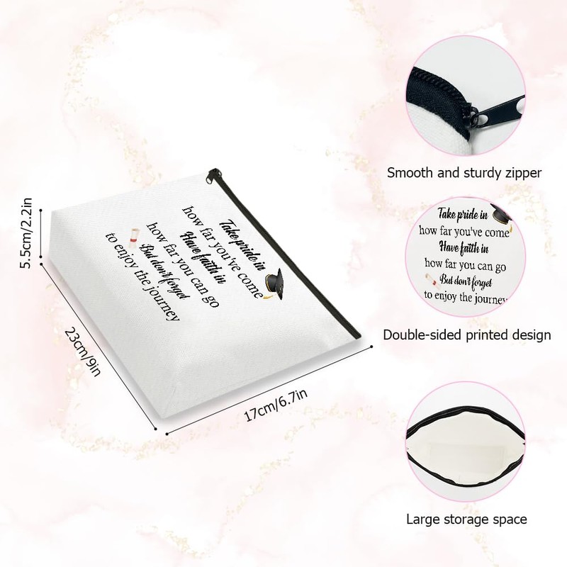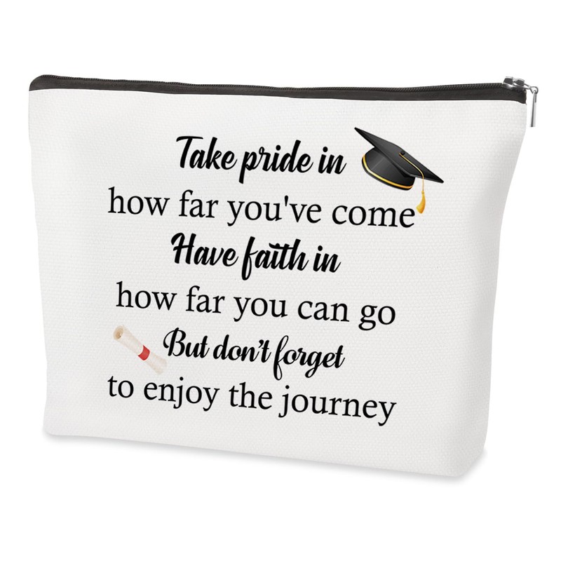 - Original Graduation Gift: The makeup bag is engraved with "Take pride in how far you've come, Have faith in how far you can go, But don't forget to enjoy the journey" Graduation makeup bag is the best gift to express blessings and inspire graduates. graduation gifts for her, graduation gifts for him, graduation gifts for nurse, graduation gifts for doctor, graduation gifts for police, graduation gifts for teacher gifts, etc