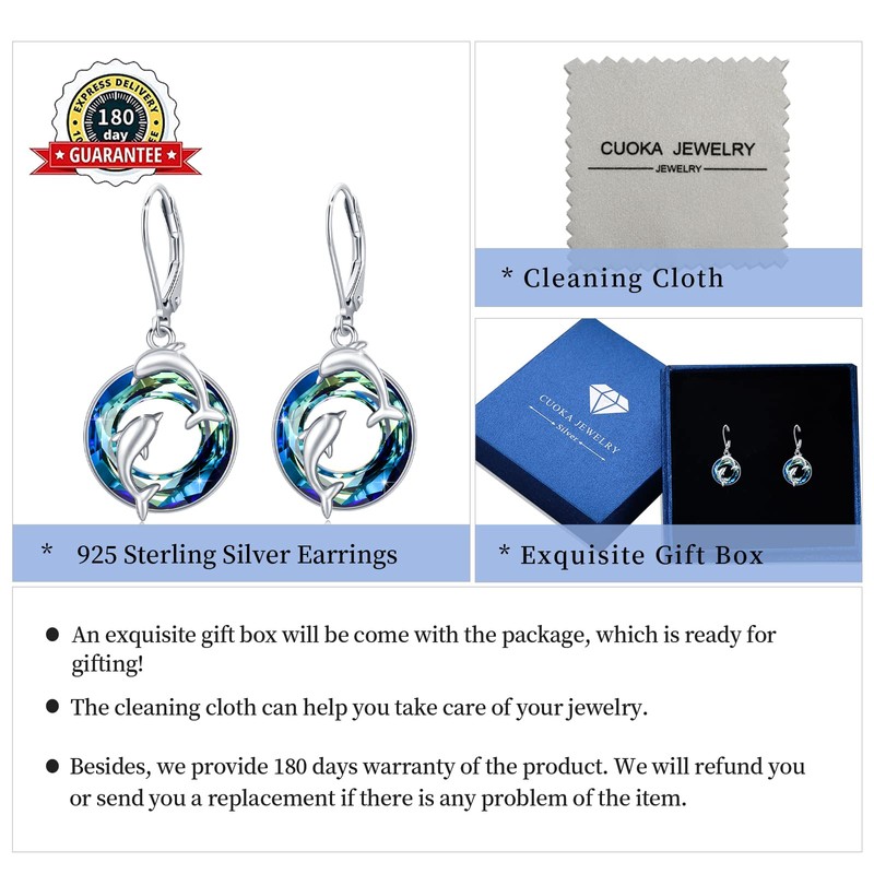 - Quality of Circle Crystal Ocean Sea Dolphin Earrings: Made of 100% 925 sterling silver, the dolphin earrings are nickel-free, lead-free and cadmium-free, which are hypoallergenic and will not turn green.You can wear it everyday.