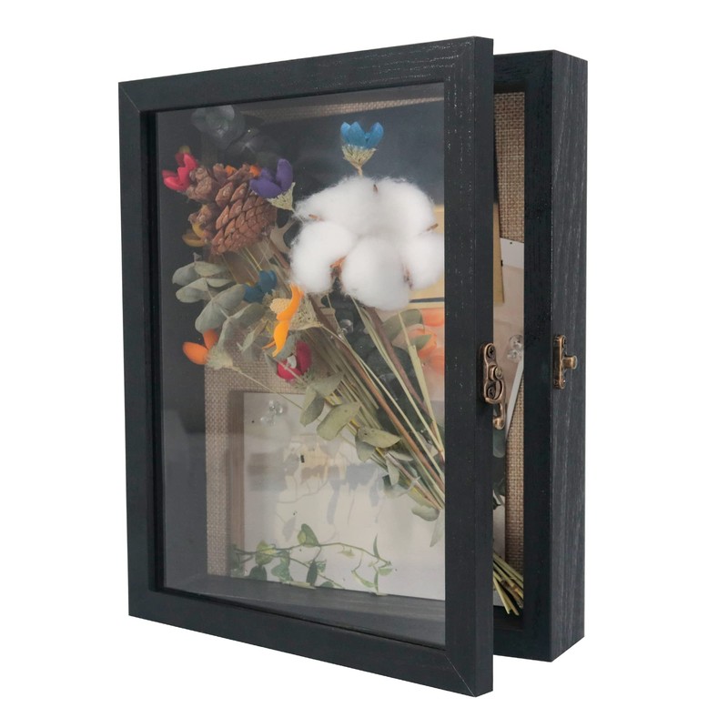 - Material The shadow box frame is made of MDF, woven fabric inner fabric with 6 pins, hazel horn lock door with real glass window, and two metal sawtooth hanging hooks on the back.