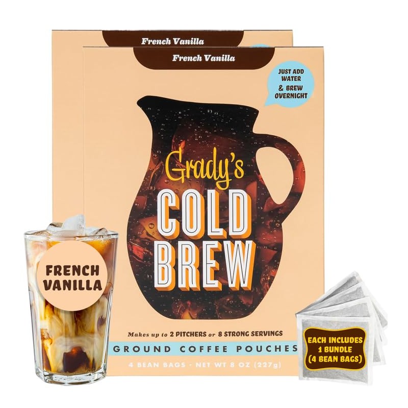 GRADY’S COLD BREW, French Vanilla, 100% Arabica Ground Coffee & Chicory Pouches, TWO Bundles of 4 Easy-to-Brew Bean Bags, Makes 24 drinks