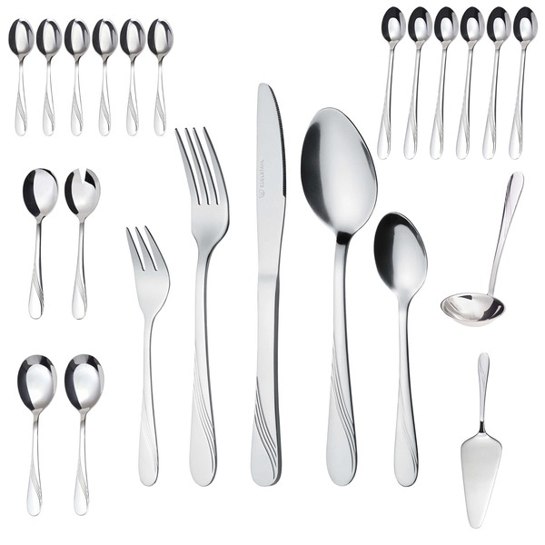 Attractive cutlery set with discreet décor. Design for decades throughout the world. Clear lines, timeless design. With this set you will receive a simple cutlery with attractive decoration for your table. The cutlery is ideal for everyday use, whether your at home or in the caravan, camper, holiday home. Made of hand-polished stainless steel with 18% chromium steel. Dishwasher safe. Suitable for allergy sufferers as it is nickel free.
