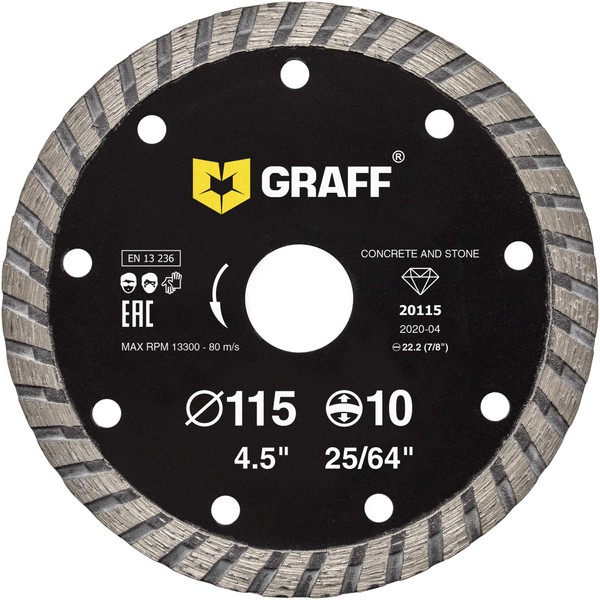 GRAFF Diamond Disc 115 mm for Stone, Concrete, Tiles, Natural Stone - Turbo Diamond Cutting Disc for Angle Grinder and Flex - Segment Height 10 mm