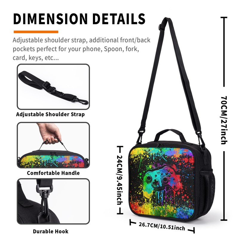 - Compact Design & Unique Printing: One large storage space, One-Side pocket and mesh inner pocket; Compact and cuboid design makes this lunch bag fit conveniently on small refrigerator shelves and into backpacks; This watercolor game pattern lunch bag can be used as a lunch bag, picnic bag, ice bag, tote bag.