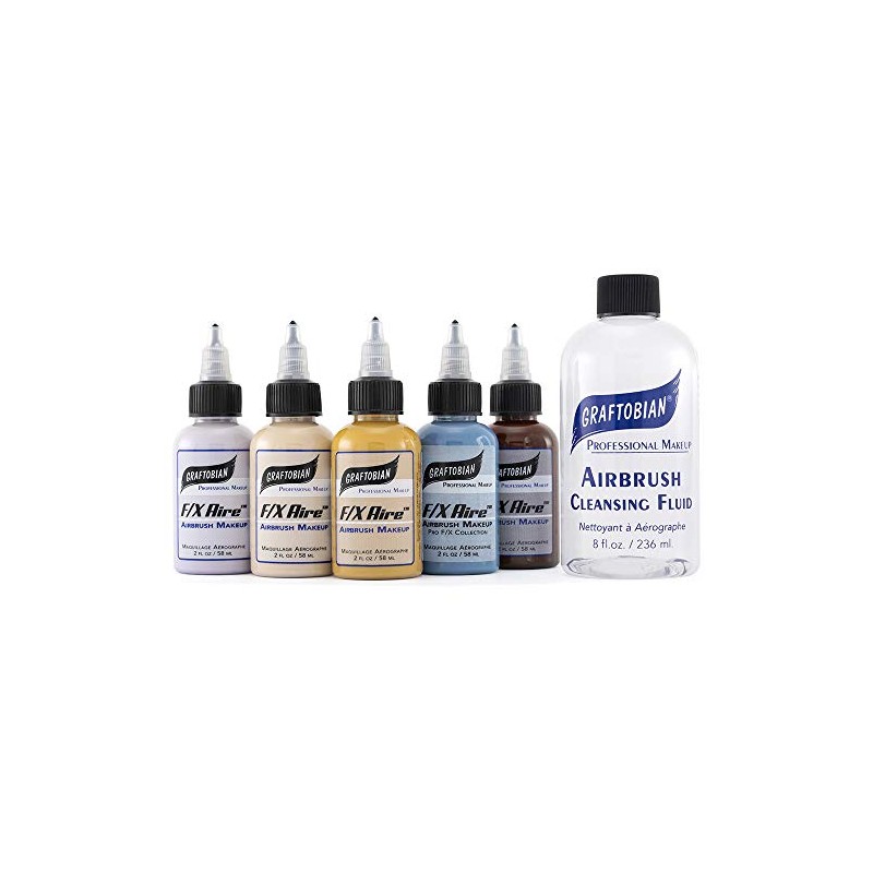 This Set Includes 5 Colors in 2 oz Bottles: Capillary Shadow, Blood Blister, Deep Yellow, Corpse Flesh, Blithe Spirit and an 8oz Bottle of Airbrush Cleansing Fluid (Total Value $133). F/X Aire is simply the finest, smoothest, most trouble free, alcohol-based HD Airbrush make-up formulation available today! If you have to crank your airbrush pressure up to 25psi just to get your paint to go through your gun, you're using the wrong product! Graftobian FX Aire requires low PSI to spray on smoothly and beautifully without flaw. F/X Aire is the best soap and water washable airbrush makeup on the market today!! Our super durable formula, available in 62 shades, is ideal for face and body artistry that needs to last 12-14 hours. When the day is done, F/X Aire can be removed easily with soap, water, and washcloth. We also offer a Clear Diluting Fluid, which is used to reduce the intensity of a color while increasing its adhesion if desired. We have ground our formulation to much smaller particle sizes than all other brands of airbrush make-up. This means virtually NO CLOGGING of your brushes and a problem-free day of spraying. We have had water theme parks using our F/X Aire for years because the kids can play in the water and still look like a lizard through all the splashing! Parents love this product because it washes off with warm water, soap and a washcloth! Finally, you'll note from the price and the 2 oz. size that you get much more make-up for your hard earned dollars. Try Graftobian once and you'll stop wasting your money on the others.