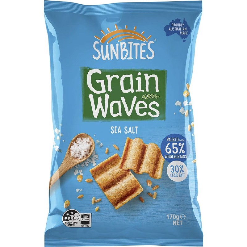 Sunbites Grain Waves Wholegrain Chips Sea Salt is proudly Australian made, packed with 65% wholegrains and 30% less fat (contains on average, 30% less fat than Smith’s Crinkle Cut potato chips).