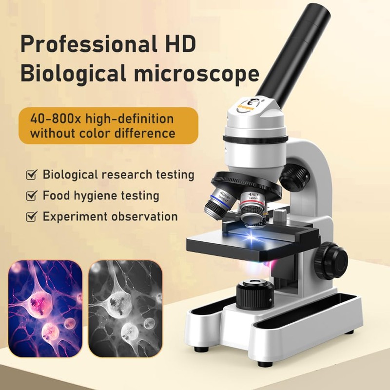 - High Precision & Diverse Magnification: Microscope delivers 40X to 800X magnification for educational and hobbyist exploration, ideal for examining biological specimens, minerals and electronics. Includes 5 prepared slides and 10 blank slides and other accessories for immediate exploration.