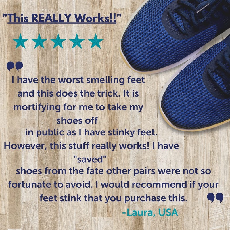 - Enhanced with Peppermint Oil – Once applied to the interior of your shoes our cooling shoe powder deodorizer works all day long to ensure fresh smelling and fresh feeling feet. 100% effective on smelly feet and footwear!