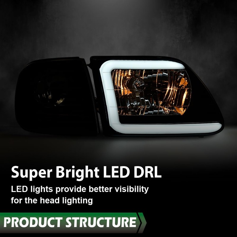 GRAND ORANGE Lightning Style Headlights LED DRL strip Compatible with 1997-2002 Ford Expedition/1997-2004 F150 /1997-1999 F250 Headlamps Smoke Lens Black Housing Amber Reflector