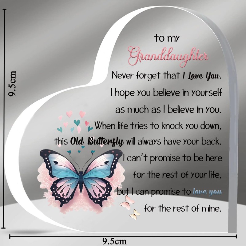 - 【CUTE CARTOON DESIGN】The heart, or butterfly-shaped acrylic plaque, embellished with floral motifs and adorable cartoon designs, paired with heartfelt inscriptions on the crystal heart keepsake, eloquently conveys your admiration and affection for the beloved peoples in your life.