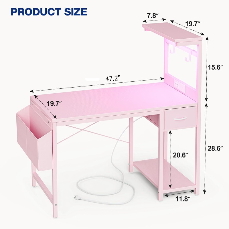 Grandder Grandder Gaming Desk 47 Inch with Power Outlet and LED Light, Computer Desk with Reversible Shelves and Storage Drawer, Pc Small Workstation for Home Office Table with Bag, Carbon Fiber Pink