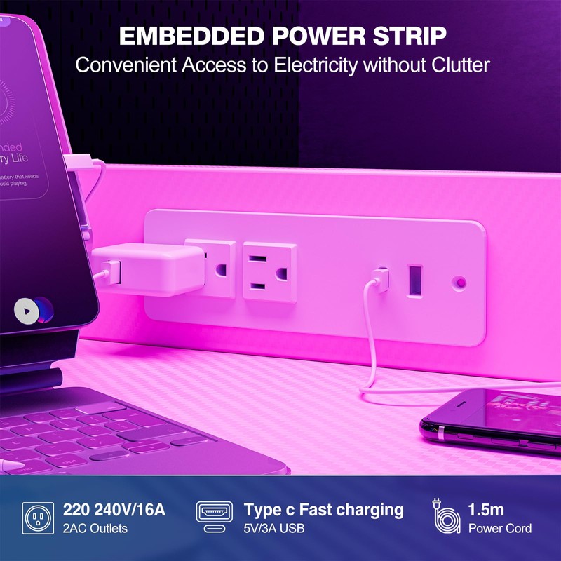 - Power outlet with two sockets, USB, and Type-C fast charging for easy device charging.