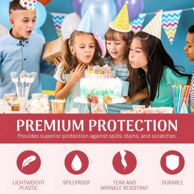 - PREMIUM PROTECTION FOR ANY TABLE - Plastic table cloths for parties disposable with slide cutter box. Made from odorless lightweight plastic that is heavy duty, durable, waterproof, wrinkle-resistant, and provides superior protection against spills, stains, and scratches.