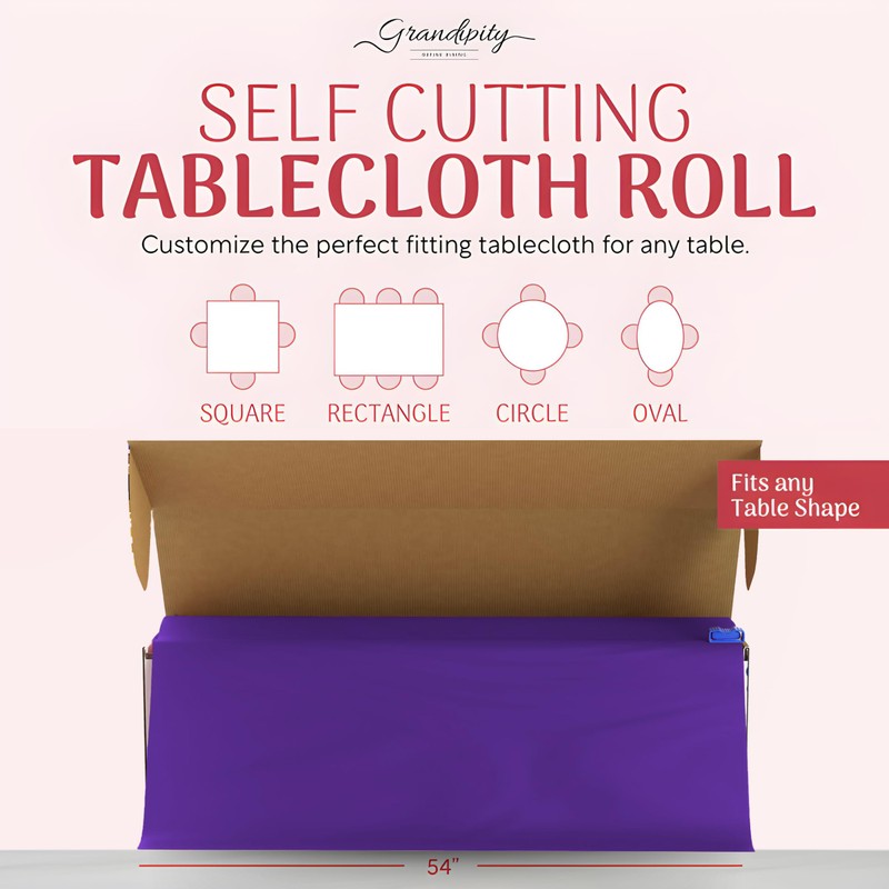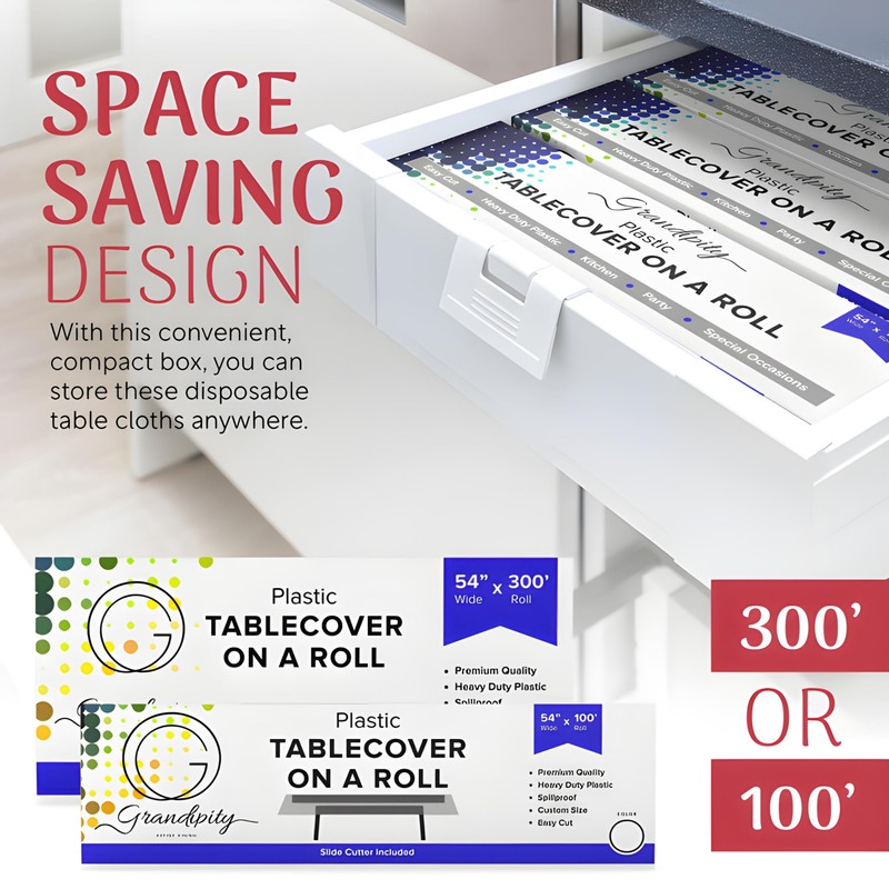 54 inches x 100 Feet or 300 Feet - Each roll of Grandipity tablecloth is equipped with a slide cutter, allowing you to create a perfectly sized plastic cover for Rectangle, Square, Round or Oval tables. Cut to suit your preference and party needs!