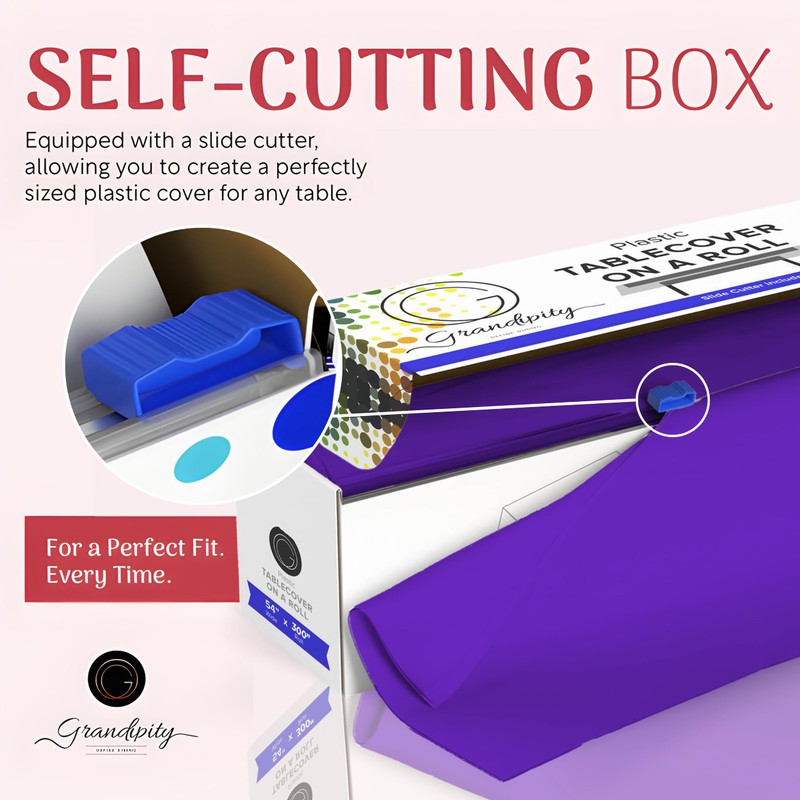 - SLIDE CUTTER TO CHOOSE YOUR SIZE - The 54 inch x 300 ft plastic tablecloth roll can be cut to size and fitted for rectangle, square, round, or oval tables. Customize the perfect fitting tablecloth for any table. Arrives neatly rolled up in a convenient box.