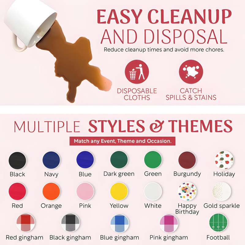 - EASY CLEANUP AND DISPOSAL - Reduce cleanup times and avoid more chores. When finished, simply roll up the tablecloth and dispose of it. Or wipe it down and store it to reuse at your next event. The clean plastic offers a zero-waste option for party planning.