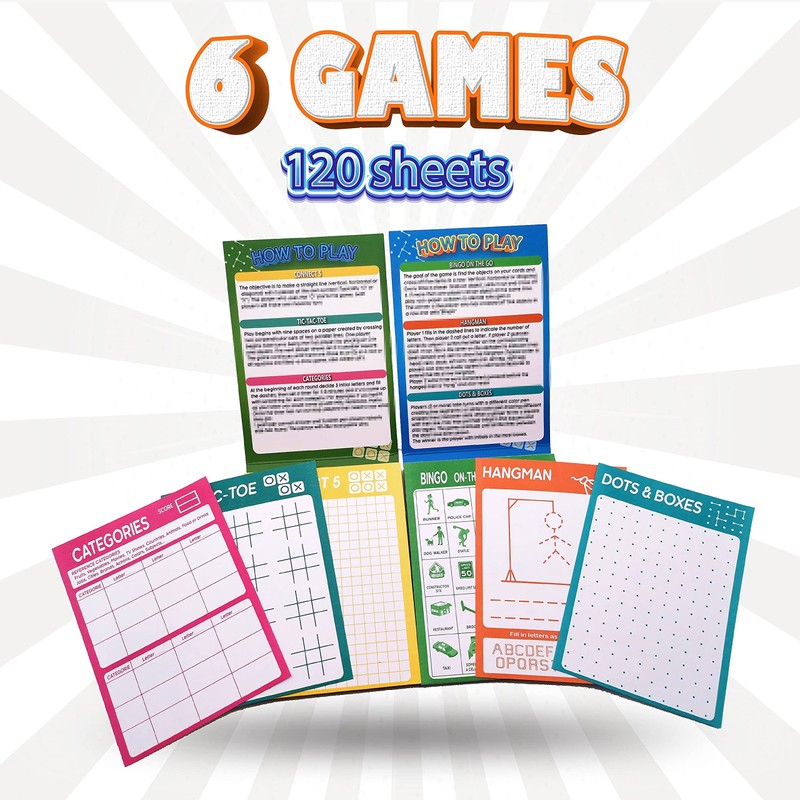 - Fun to Play: 6 games cover Hangman, Dots & Boxes, On-the-Go Bingo, Connect 5, TIC-TAC-TOE and Categories. Keep kids engaged that only require paper and pencils. These games will challenge kids and keep them entertained for hours.