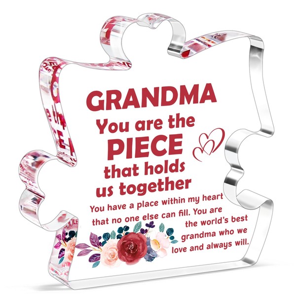 - 【Grandma Gifts with Saying】The message on this sign reads "Grandma, You are the piece that holds us together. You have a place within my heart that no one else can fill. You are the world's best grandma who we love and always will." It is a beautiful reminder to your grandma of the special bond between grandmother and grandchildren and the love and appreciation that comes with being a grandma. This unique and heartfelt design is sure to make her smile and appreciate her thoughtfulness.
