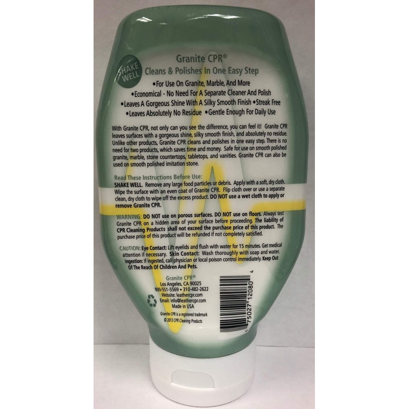 Leather CPR GC-18QC12 Granite CPR Cleaner & Polish 18 Ounce cleans and polishes granite in one easy step. Use on smooth polished granite, marble and stone countertops, tabletops and vanities. Leaves a gorgeous shin with a silky smooth finish. Streak free. Economical. No needs for a separate cleaner and polish. Non-toxic. No residue. Gentle enough for daily use.