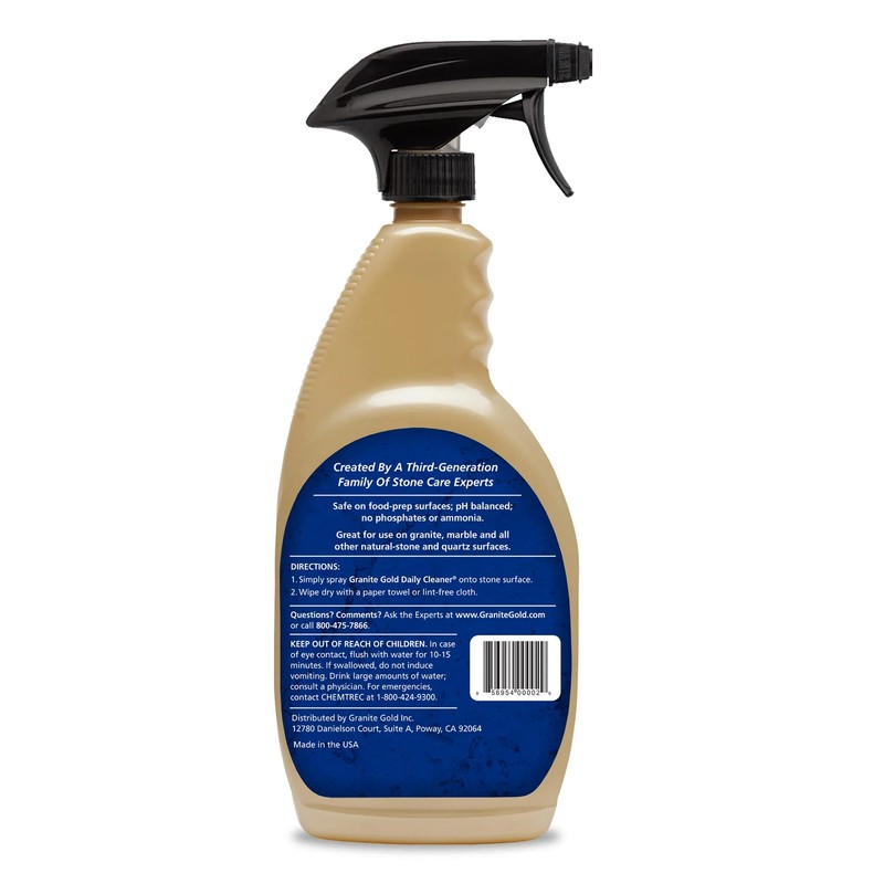 The stone care experts who developed Granite Gold have created a stone surface cleaning product that is unrivaled in versatility, safety, and ease of use. Unlike most other natural stone cleaning products that leave behind residue, contain toxic chemicals, or have an unpleasant smell, Granite Gold leaves behind no streaks and features a mild citrus scent. Granite Gold Daily Cleaner comes in a 24-ounce convenient spray bottle. Using this cleaner regularly will keep your stone surfaces protected and looking as gorgeous as the day they were installed. What good is a cleaning product if it leaves behind ugly streaks, smudges and residue that you have to clean up again? The Granite Gold Daily Cleaner creates an absolutely flawless, streak-free result.