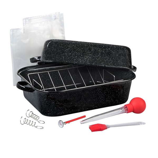 Granite Ware 25 lb Rectangular Roaster Set (10pcs), includes Lid, V-Rack, 2 pack brining bags, oven/grill-safe meat Thermometer, Turkey Baster with sylicon bulb, small brush