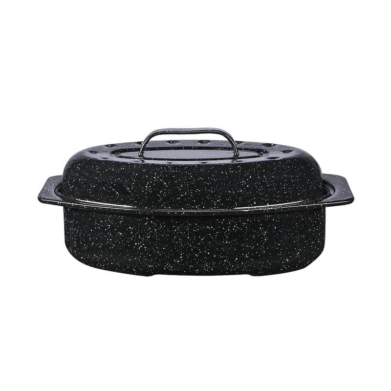 Granite Ware 13-inch oval roaster with Lid. Enameled steel design to accommodate up to 7 lb poultry/roast. Resists up to 932°F. Ideal for preparing meals for two!
