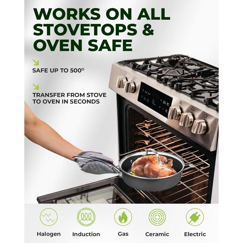 - Quick and even heating: forged from a single sheet of hard anodized aluminum, each piece of cookware quickly and evenly conducts heat from end to end, ensuring there are no dead zones or hot spots and providing deliciously and perfectly cooked foods day in and day out