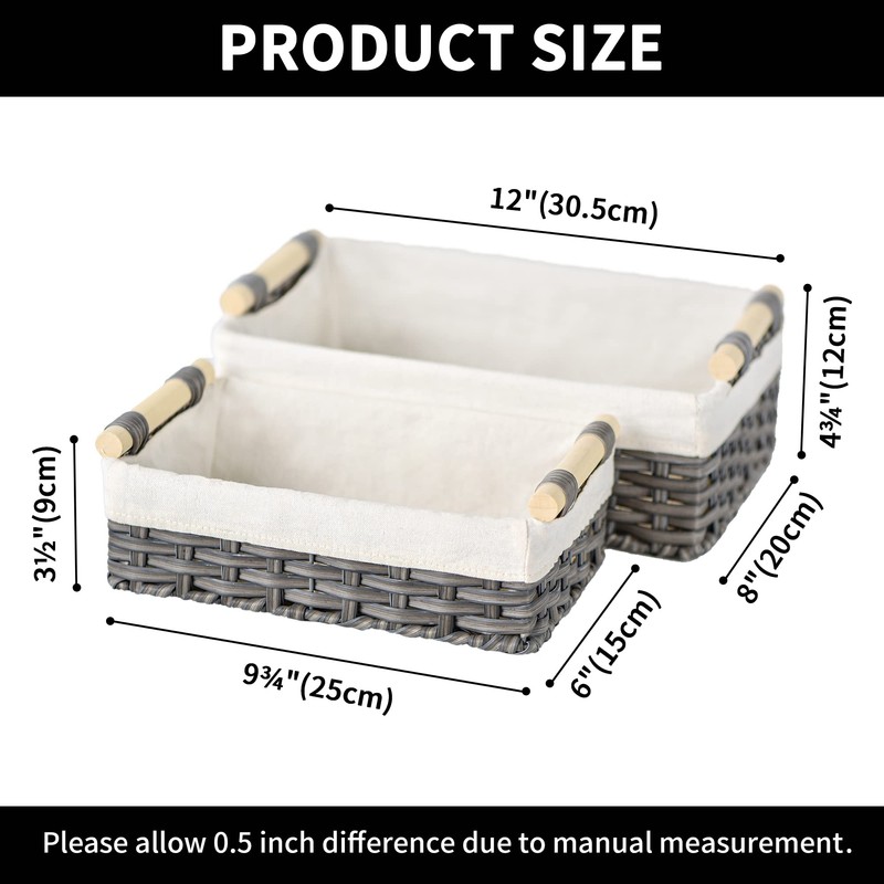 - One set of 2-pack wicker baskets with wooden handles, measuring 12" x 8" x 4 ¾" and 9 ¾" x 6" x 3 ½" (L x W x H) respectively.
