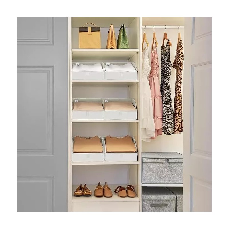 - Versatile Storage - Trapezoid design lets finding things convenient, also allows easy access when put on the top shelf. Ideal closet storage bins for storing clothes, bags, yarns, toys, DVDs, linens, and more.
