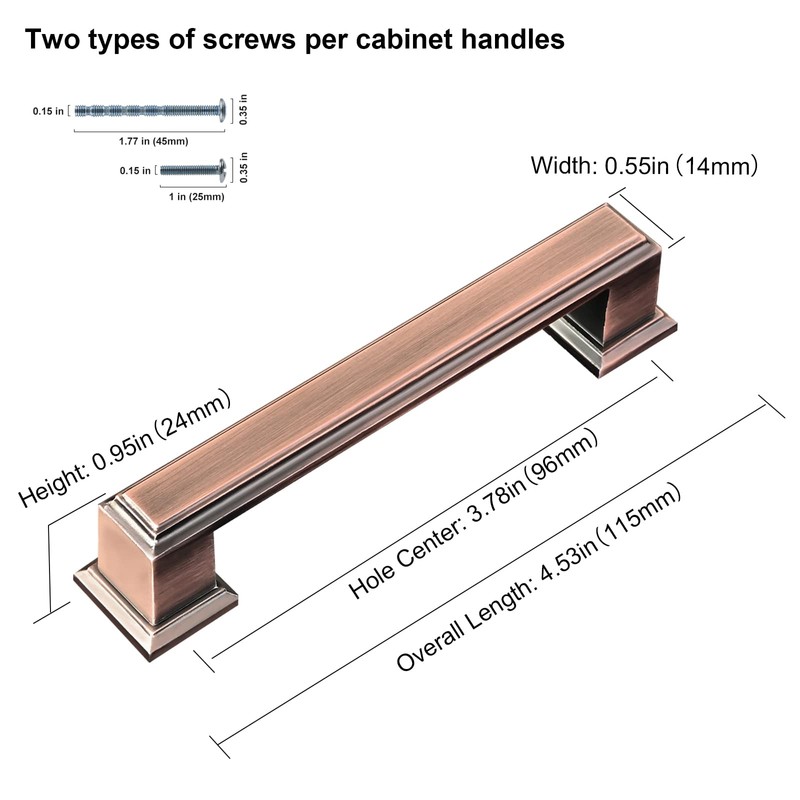 - DIMENSION:3-3/4 Inch(96mm) Center to Center ( distance between holes), 4.53 Inch(115mm) Total Length,0.55 Inch(14mm)Width, 0.95 Inch(24mm) Height.The dimensions of the two types of screws are 1.57 Inch(40mm) and 1 Inch(25mm),For your choice and installation,If you need additional screw size, please reach out to us.