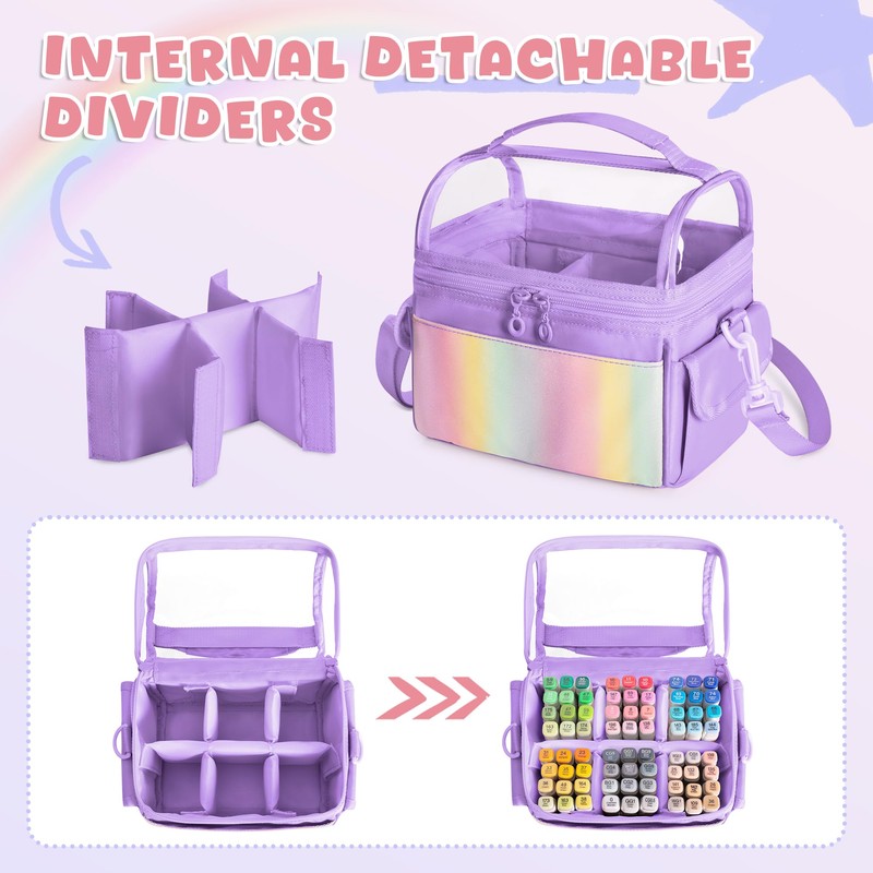 GRAOSO Marker Organizer Case for up to 72 Markers, Marker Storage Bag with Detachable Divider and 3 Extra Pockets, PVC Top Easy Find Your Need, Handle and Shoulder Strap, Purple (Case Only)