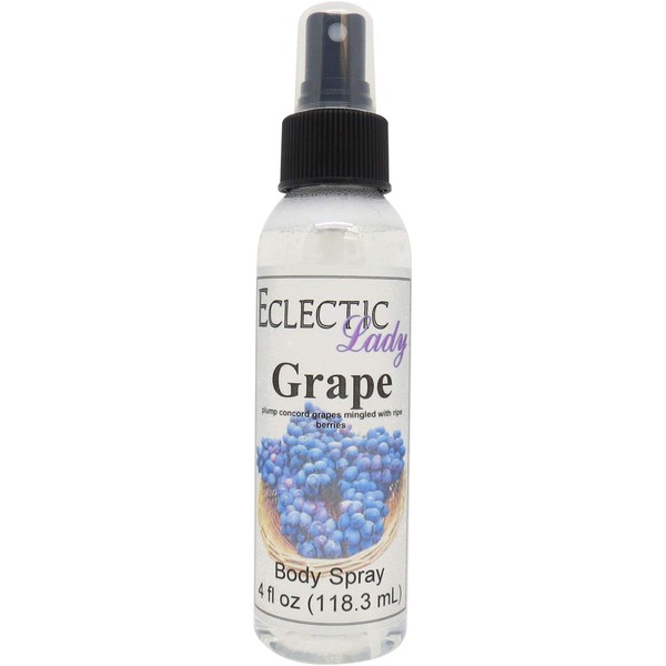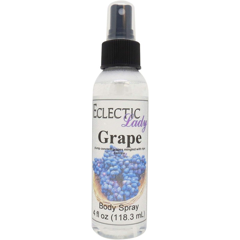Our grape fragrance is fresh, juicy notes of plump concord grapes playfully mingle with ripe, delicious berries. This fragrance is phthalate free. Our body spray adds a little bit of moisture to your skin along with a light fragrance. Our Double Strength formula contains double the fragrance of our original body sprays for people who like a stronger body spray. All of our products are made to order. To avoid leakage in transit, Eclectic Lady tapes all caps on our sprays and places each bottle into it's very own reclosable bag.