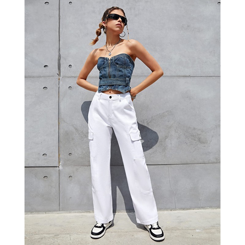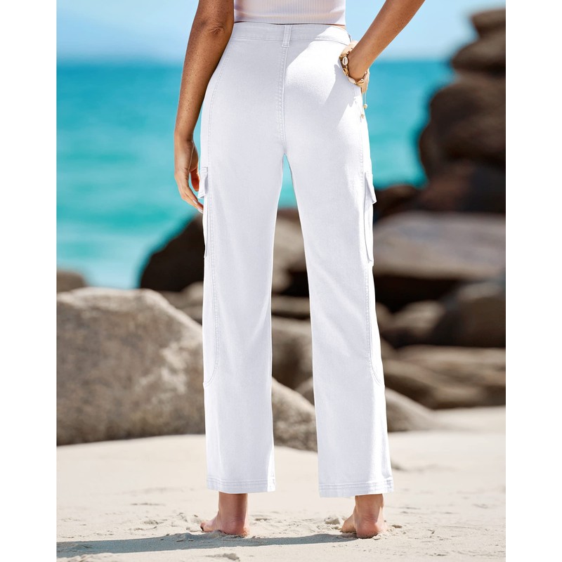 GRAPENT High Waisted Cargo Pants - Women's Summer Wide Leg Pants with Pockets in Brilliant White Size 12