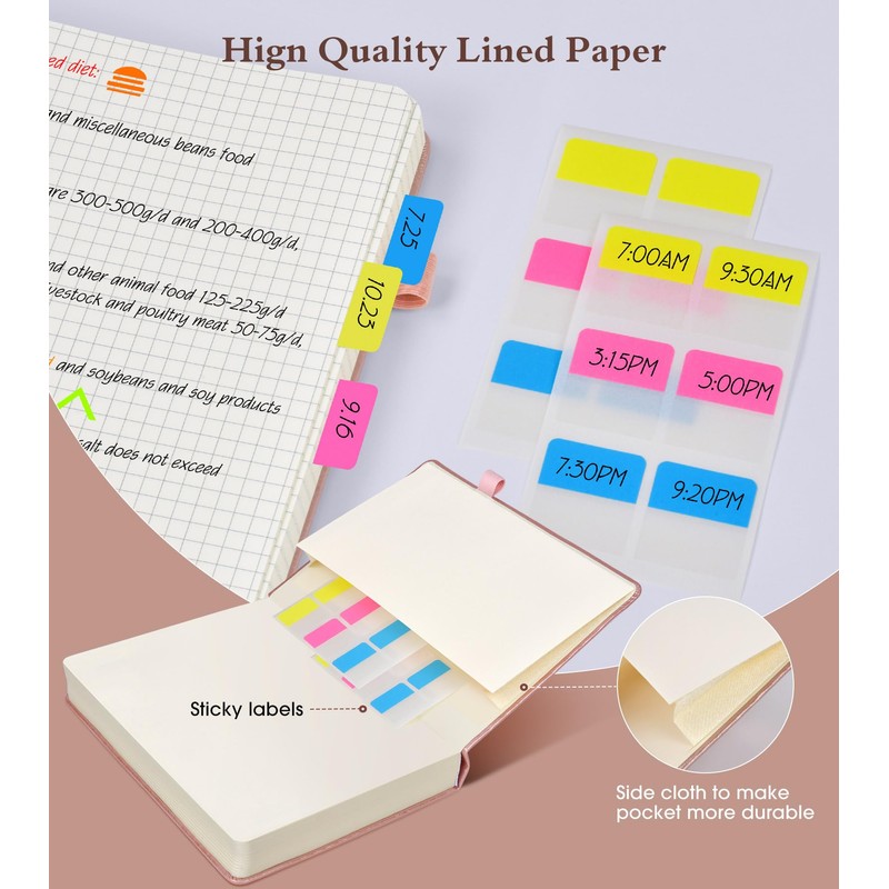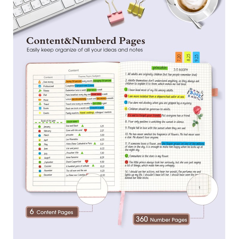 - 【Humanized Design】 ❶ 360 numbered pages, 6 contents pages, you can easily keep organize of all your ideas and notes.❷2 Divider sticky notes, 2 Bookmarks to help you find important content faster..❸ Back Inner pocket can holds notes, business cards, small gadgets, etc. ❹ Closes with an elastic band, Pen holder loop for any pen.