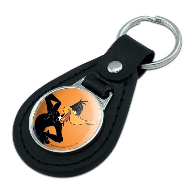 - DURABLE RESIN-TOPPED DESIGN - This Looney Tunes Daffy Duck leather and metal key chain features the Looney Tunes Daffy Duck design shown encased in resin, and mounted on a nice black leather backing.