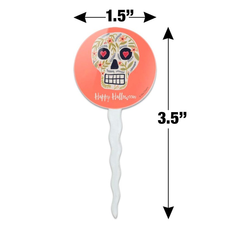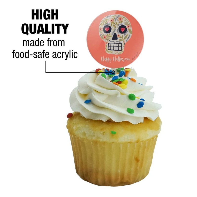 - The featured design is 1.5" (3.8cm) in diameter and is printed on food-safe acrylic. Including the zany, squiggle-shaped pick, each topper is 3.5" (8.9cm) in total height.