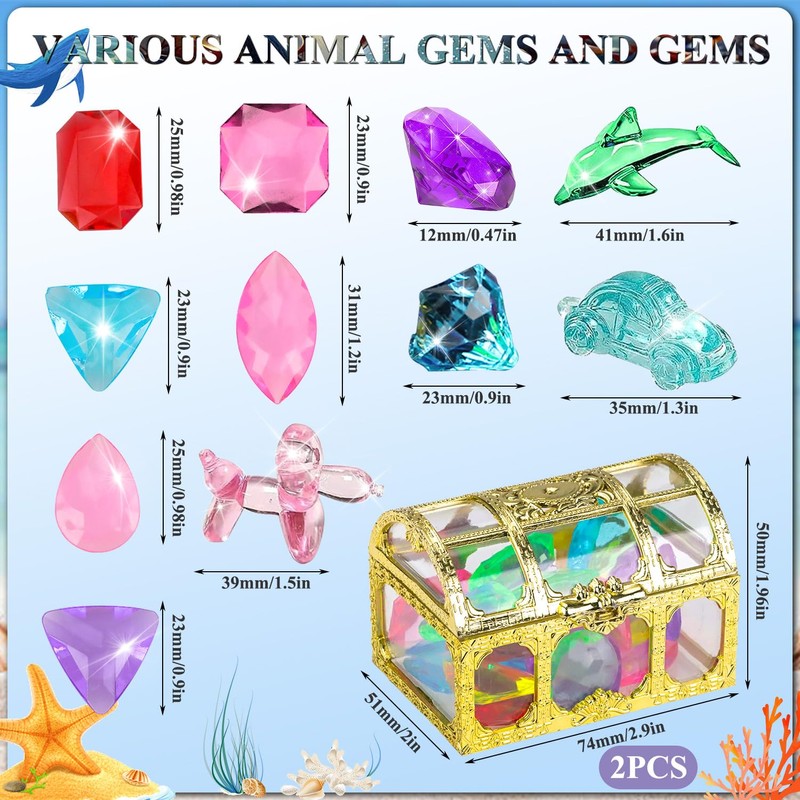 - Diving toy for children set: you will receive a total of 51 colourful acrylic gemstones and 2 small golden treasure chests. The colours and shapes of the diving toy children are rich and diverse, and the quantity and style are sufficient to meet your different needs. The diving toy set would bring a lot of fun for your children under the swimming pool
