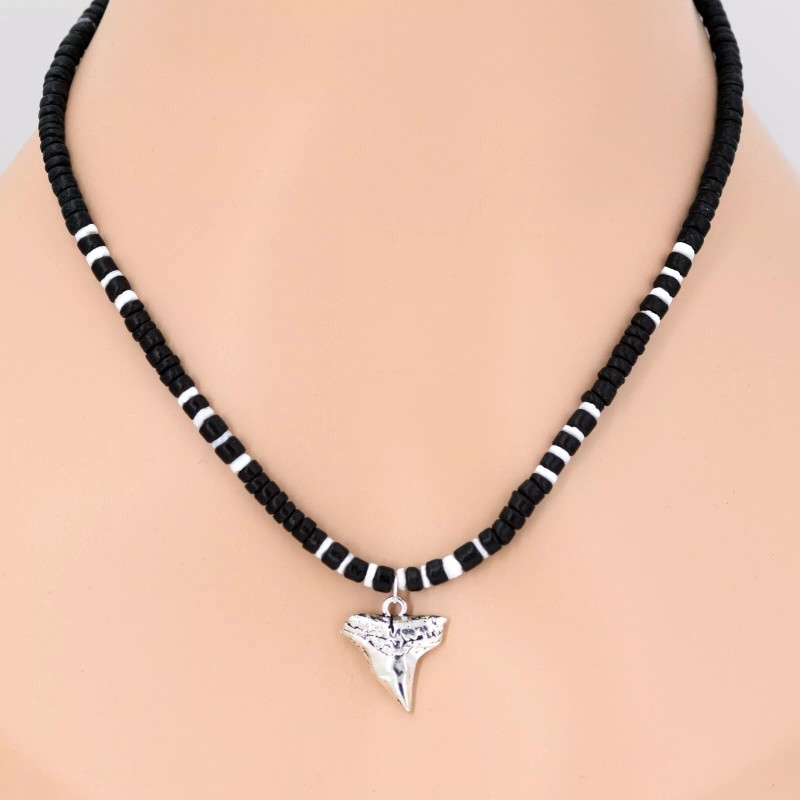 Grass Shack Trading Silver Shark Tooth Necklace Coconut and Puka Shell Beads 19, 22, or 25" 7035-06 - 19 in